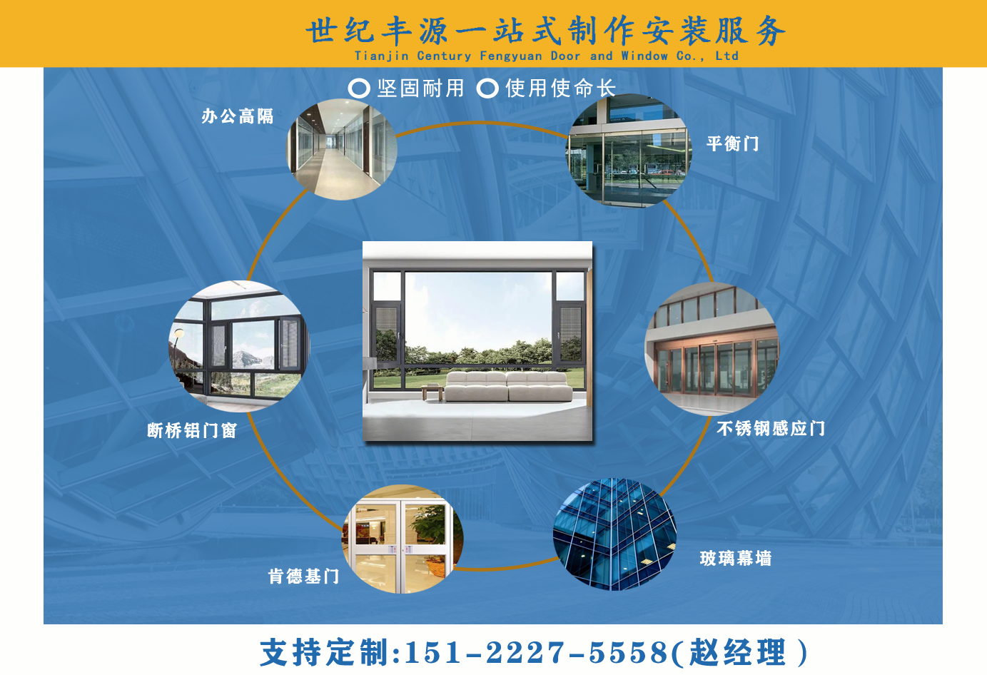 天津世紀(jì)豐源門(mén)窗有限公司從事斷橋鋁門(mén)窗,玻璃幕墻,平衡門(mén),肯德基門(mén),不銹鋼感應(yīng)門(mén),百葉窗,辦公高隔,制作安裝一站式訂制生產(chǎn)及配套服務(wù)等?! 」咀猿闪⒁詠?lái),始終堅(jiān)持以人才為本、誠(chéng)信立業(yè)的經(jīng)營(yíng)原則,薈萃業(yè)界精英,成熟的技術(shù)、管理方法及企業(yè)經(jīng)驗(yàn)與國(guó)內(nèi)企業(yè)的具體實(shí)際相結(jié)合,為企業(yè)供給各個(gè)方面的解決方案,使企業(yè)在激烈的市場(chǎng)競(jìng)爭(zhēng)中始終堅(jiān)持競(jìng)爭(zhēng)力,實(shí)現(xiàn)企業(yè)快速、穩(wěn)定地發(fā)展?! ≠|(zhì)量好、服務(wù)好、才能信譽(yù)好,公司已在諸多領(lǐng)域取得輝煌成績(jī),愿意成為您可信賴(lài)的長(zhǎng)期合作伙伴?! ∽屛覀償y手同行,共同實(shí)現(xiàn)“讓普通老百姓都用得上高端門(mén)窗”...